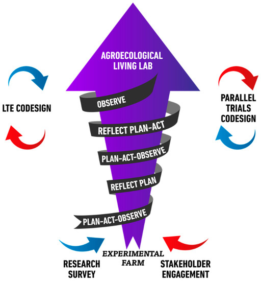 Long-Term Experiments (LTEs) might play a crucial role by providing a safe place where changes can be played out and negotiated among a variety of interested actors. An LTE promotes transformation pathway of agri-food systems based on redesign, aiming to tackle the research priorities with local producers, representing a potential hub of common knowledge and innovation [19]. Moreover, the LTEs allow the long-term monitoring and assessment of the complex biological and ecological processes on which cropping system functioning is based on. Therefore, they represent an example of agroecological transition, tests of tools for assessing advances in agroecology, and food policy that puts forward the needed steps toward transformation [5]. Furthermore, when the LTEs involve parallel local farm-trials orbiting around the experiments (biophysical components), and other stakeholders engaged in decisional process and result evaluation (social component) through a participatory action research (PAR), they can be considered as agroecological living labs (ALL) [20].