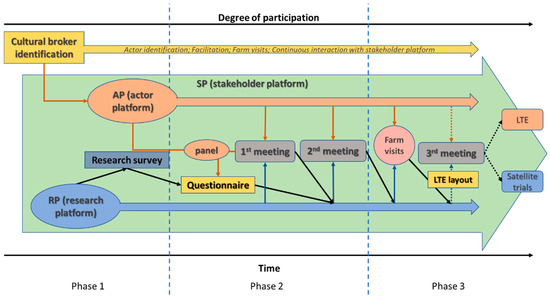 A co-innovation process was implemented to activate the ALL and set up the LTE embedded with the actual research needs of the area in which the LTE is located, following the three phases described by Ciaccia et al. [14]: (1) identification both of the cultural broker and the network of actors (actor platform—AP); (2) definition of the objectives of common interest for researchers and AP to co-design the LTE; and (3) definition of the LTE layout and setting of parallel trials at satellite farms (the ALL definition). The activities started in 2019 and are still ongoing.
