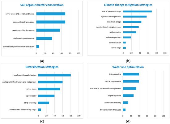 Results of questionnaire: (a) interest on subtopics of soil organic matter conservation; (b) climate change mitigation strategies; (c) diversification strategies; and (d) water-use optimization. Results are expressed as percentage of votes on the total participants (n = 16).
