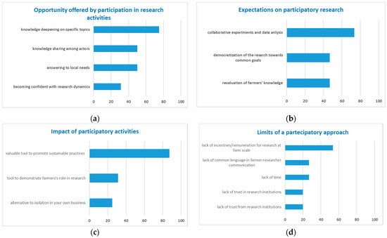 Individual vision and perceptions of the panel pointed out the participatory research as an opportunity (Figure 4a) to increase own knowledge on specific topics (75%), to share own competence with other actors (50%) and to connect local needs with research priorities (50%). About expectations (Figure 4b), the panel identified participatory activities to set up a peer-to-peer experimental activity and data analysis (75%), to obtain a more democratic research aimed to transdisciplinary goals (50%) and to valorize farmers’ knowledge (50%). The panel considered the implementation of participatory research as positively impacting on (Figure 4c) the promotion of sustainable practices (88%), the revaluation of farmers’ role in research (31%) and the isolation often characterizing farmers’ activity (25%). Finally, the panel recognized the lack of incentives to farmers (53%), the lack of common research-farmer/technicians’ language (31%) and the lack of time (31%) as the main constraints for the implementation of research activities (Figure 4d).