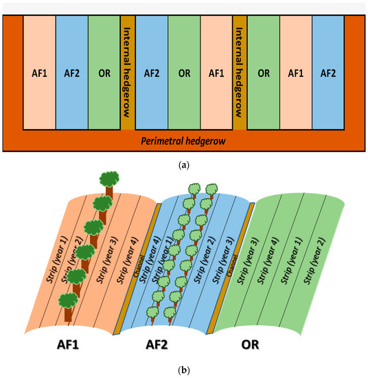 The systems should be organized as follow: (i) AF1, a central alley of two rows of shrub/bush crops separating the four rotative area into two groups (Agroforestry System 1); (ii) AF2, a central alley of one row of fruit crop separating the four rotative area into two groups (Agroforestry System 2); and (iii) OR, organic rotation systems.