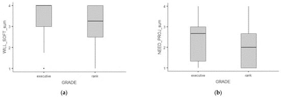 Figure 1 illustrates the most significant statistical differences at the level of this group of respondents by job title. Figure 1a shows the differences between the rank-and-file employees and the executives in the willingness to train in the Soft skills group. Figure 1b illustrates the differences between both groups of respondents in the need for further training in the group of professional competences Project.