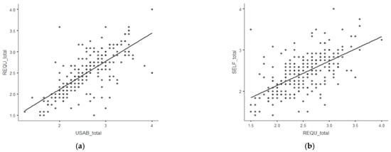 Figure 2. (a) The degree of interdependence between the required and usable levels of competences and (b) the degree of interdependence between the level of subjectively assessed competences and the requirements of the employer.