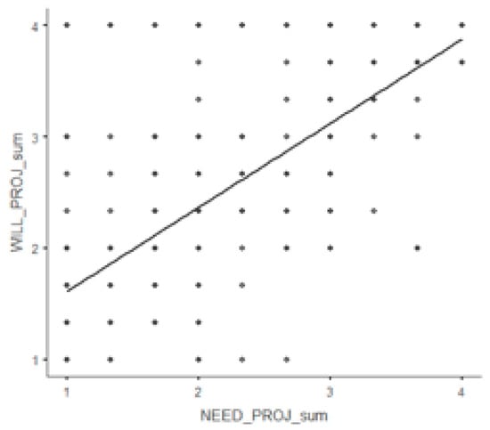 At the end of the analysis, hypothesis H6 was tested, i.e., establishing whether there was a positive correlation between the need and willingness to learn. This relationship has been validated for all competence groups (Table 5), with the Project group showing the strongest degree of positive interdependence. This degree of dependence is demonstrated in Figure 4.