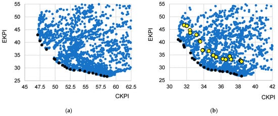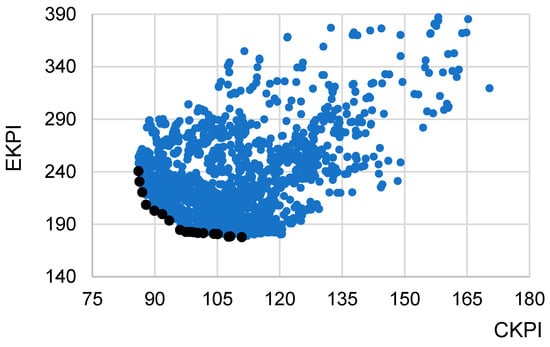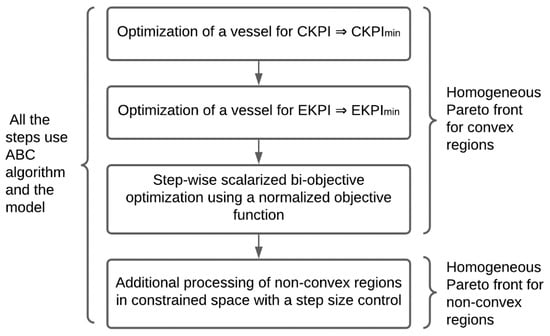 The proposed optimization process comprises two main phases. The first phase consists of a step-wise scalarized bi-objective optimization using a normalized objective function as per Equation (1). This ensures homogeneity for the convex parts of the Pareto front. The values of CKPImin and EKPImin are obtained in advance by two separate optimization runs. In the first run, CKPI is used as an optimization objective, whereas in the second run EKPI is used as an objective. This provides two boundary points of the Pareto front.