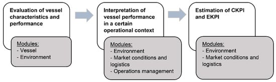 The vessel evaluation model, presented in Figure 3, estimates a vessel’s EKPI and CKPI for a given set of inputs. Figure 4 provides a module decomposition of the model. First, the model calculates a vessel’s performance, considering ship design characteristics only. Second, the model calculates a vessel’s performance in a specific operational context. We define the operational context in terms of parameters presented in Figure 4.