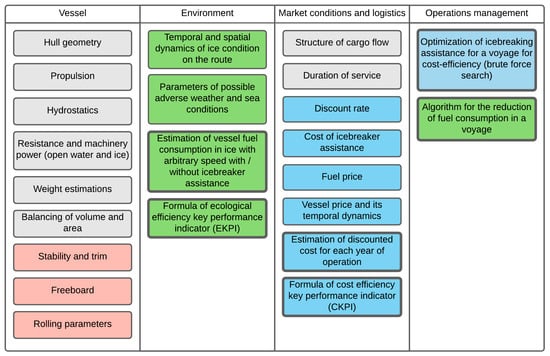 Module decomposition of the vessel evaluation model. The modules that are the most important for this study are highlighted by a bold frame. The background color reflects the module category: gray—technical, red—safety, green—environment and emissions, blue—economics.