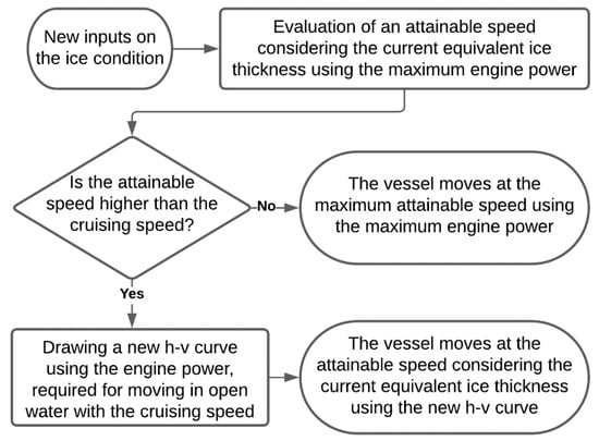 As per Figure 5, the algorithm evaluates the maximum attainable speed during independent operation considering the prevailing equivalent ice thickness. If the attainable speed is lower than the set open water cruising speed, the vessel moves at the maximum attainable speed at MCR. Otherwise, the algorithm draws a new h–v curve for a lower engine load equal to the required power for operating at the set cruising speed in open water. Thereafter, the vessel sails at the attainable speed corresponding to the updated h–v curve considering the prevailing equivalent ice thickness. Controlled by the algorithm described above, the vessel operates at MCR only in heavy ice conditions. This prevents the vessel from operating at excessively high speed in ice and open water.