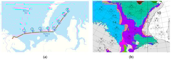(a) The route between the port Murmansk to the Pobeda field used in the case study; (b) an ice chart determined by AARI covering the Barents Sea [32].