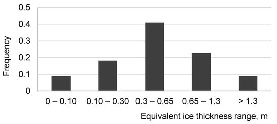We determined the prevailing ice condition for each segment, assuming that vessels can make minor deviations from the planned route to avoid the most difficult local ice conditions. This assumption is implemented when extracting ice data from the ice charts. Based on the ice data considered, we determined ice thickness frequency distributions for each month and route segment. An example this distribution, representing segment 4–5 in March, is presented in Figure 7. As a simplification, we calculate a vessel’s performance based on the average ice thickness of a thickness range. The results were assembled into a database, which was used as input for the simulations.