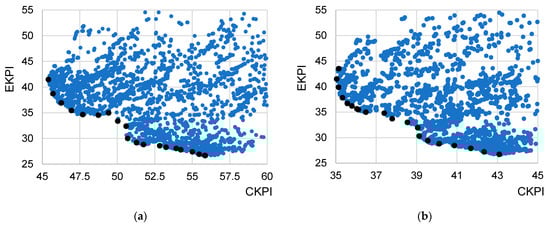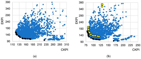 Optimization results for case study 1 (a) and 2 (b). The black points highlight the Pareto front and blue points represent other feasible solutions.