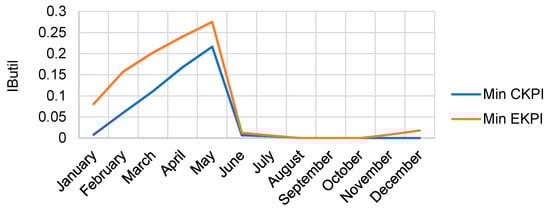 Dynamics of the value of IButil during the year for vessel Min CKPI and Min EKPI (case study 1).