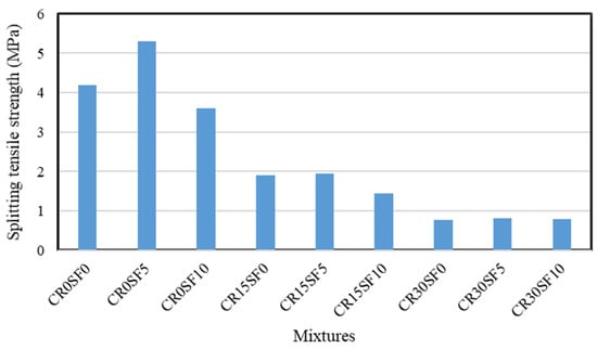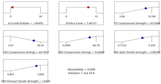 | No. of Run | CR (%) | SF (%) | Compressive Strength (MPa) | Flexural Strength (MPa) | Splitting Tensile Strength (MPa) | Desirability |