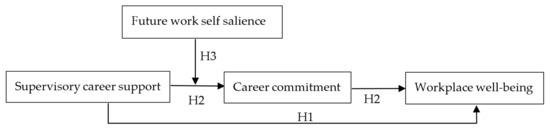 While it is important to know what can predict workplace wellbeing, knowing how and when predictors work can help us to advance even further. So far, little is known about how employees’ wellbeing in the workplace is determined [17]. For example, through what intervention mechanisms is supervisory career support associated with workplace wellbeing? Therefore, this study attempted to propose career commitment, which represents the career-based identities of employees, as a potential intervention variable to address the question of why supervisory career support can predict employees’ wellbeing at the workplace. Career commitment is believed to mediate the relationship between supportive work conditions and employees’ wellbeing, and previous studies have found that career commitment can mediate the relationship between professional identity and subjective wellbeing [25]. Therefore, we expect it to play a similar role in the link between supervisory career support and workplace wellbeing. Accordingly, the second purpose of this study was to investigate the mediating effect of career commitment. In addition, the theory of career motivation [26,27] suggests that the effect of situational characteristics on career decision making and career behavior is influenced by individual characteristics. Thus, this study further explored the moderating role of future work self-salience (FWSS), which represents the ease of construction and clarity of an individual’s hoped-for work-based identity [28]. Namely, we demonstrate the individual factor (e.g., FWSS) that makes supervisory career support more or less effective.