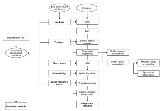 This study follows the WHO’s framework and selects land use, transport, green space, and urban design as the four components of the built environment. LUM and FAR (Floor area ratio) were selected for land use; density of road network and destination accessibility for transport; normalized difference vegetation index (NDVI) for green space; and walkability index for urban design, respectively. In addition, socioeconomic status is also an important determinant of health. Thus, demographic and socioeconomic factors were added to the research framework. The theoretical analysis model is shown in Figure 1.