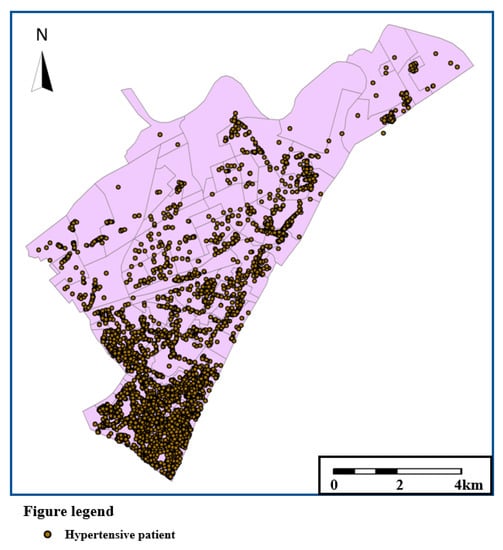 The raw data were positioned by a coordinate conversion system using geocoding software and linked to a community base map (Figure 3). The prevalence data of hypertension per 10,000 people were calculated in each community (Figure 4). Arcgis software was utilized to see if there was spatial aggregation in the prevalence of hypertension at community level with visualized images.