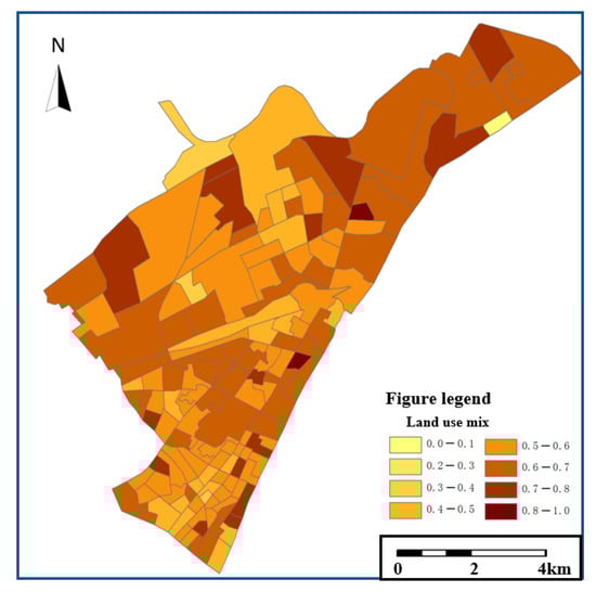 LUM is used to evaluate the degree of mixing of various land uses in a certain area. It was difficult to create a quantitative calculation method for LUM before Cervero and Kockelman first proposed the nine-square grid model [42]. At present, the entropy model proposed by Frank et al. is widely recognized by scholars [43] (Figure 5).