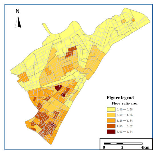 Due to the small research scale and most buildings being high-rise buildings in the study area, FAR was selected as the land-use intensity indicator. The FAR is the ratio of the total building area to the land area (2) (Figure 6).