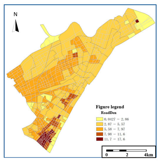 The density of road networks (RoadDen), which is the ratio of the total length of all the roads to a unit area, can be used to characterize the connectivity level. A high RoadDen indicates better walkability in the neighborhood and promotes more physical activity, such as walking and cycling (Figure 7).