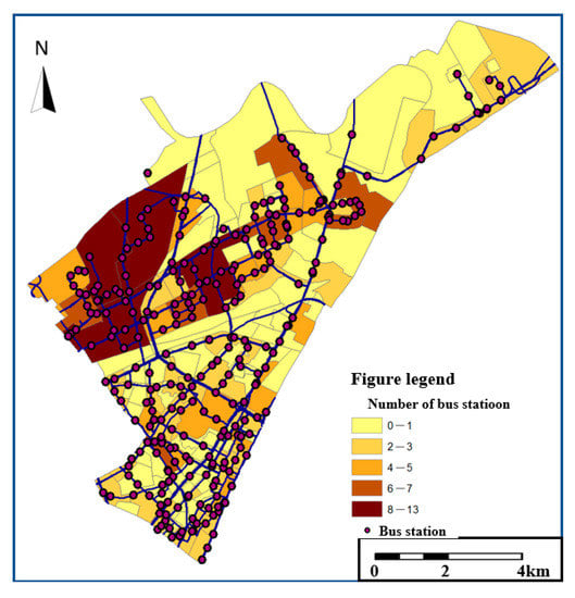 The density and coverage of bus stations were selected as two indicators to calculate bus accessibility (BusIndex). The density of bus stations is the number of bus stations per unit area (the weight of subway stations was twice that of bus stations) (Figure 8). The coverage of stations is the percentage of the area served by the bus and subway stations. To identify the service radius of public stations, we checked the literature. Referring to some of the existing studies [45,46], we identified that the bus stations covered a 300m range and the subway stations covered an 800 m range. The weights of bus station density and coverage were set to 0.4 and 0.6 respectively (3) (Figure 9).