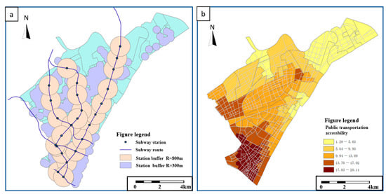 (a) Coverage area of bus and subway stations; (b) public transport accessibility of the communities.