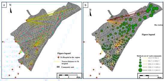 (a) Distance from each community to the nearest medical facility; (b) analysis of the distance cost of medical facilities in the communities in the Jiang’an district.