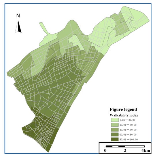 Morphological parameters, such as sky view factor (SVF), street width to building height ratio (W/H), building coverage ratio (BCR), and building surface fraction (BSF) etc., are key factors of urban design. While morphological parameters were linked with the vibrancy of the city, they were too many to be examined in this study. Besides, the emotional and subjective feelings of residents on urban design make it difficult to obtain a quantitative measure [47]. The walkability index (WI) is a recently emerged indicator that evaluates the vibrancy of cities [48], indirectly reflecting the quality of urban design [49,50]. Many algorithms exist to calculate the WI. This study used the walk score algorithm, which is relatively mature and is recognized by most scholars worldwide [51]. The walk score was calculated as the usage of various public facilities with different weights based on the travel behaviors of pedestrians. The walking distance attenuation, intersection density, and road length were considered to improve the accuracy of the WI, Equation (4) (Figure 11).