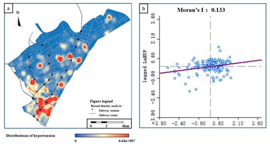 (a) Kernel density analysis of distribution of the hypertension patients; (b) scatter plot of Moran’s I index.