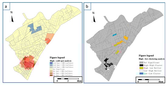 (a) Hot–cold spot analysis by Getis-Ord Giand and Anselin Local Moran’s I; (b) results of high–low clustering of hypertension prevalence at the community level.