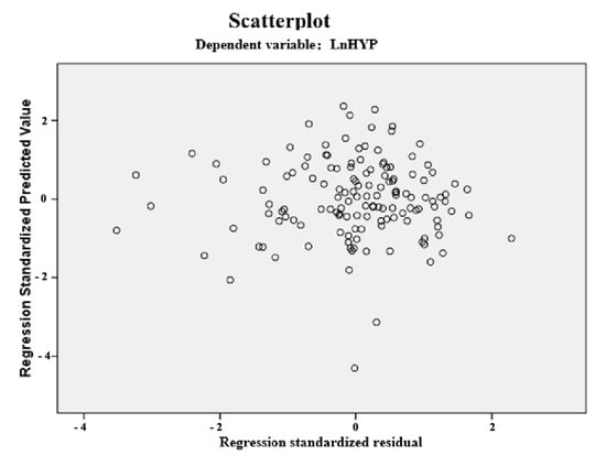 Based on the research framework (Figure 1), the LUM, FAR, NDVI, MedCost, GymCost, AHP, WalkIndex, RoadDen, BusIndex, and PopuDen were used as the explanatory variables. The prevalence of community hypertension was an independent variable. The results are shown in Table 1. The P-values of the models were all less than 0.01, indicating that the built environment factors significantly affect the prevalence of hypertension (confidence ratio > 99%). The all-variables model (model 1) had an R2 of 0.517 and an adjusted R2 of 0.210. However, some variables in models 1 and 2 had relatively large variance inflation factor (VIF) values, indicating the existence of multicollinearity in the model. The optimal model (model 5) was obtained after excluding the covariant variables. The R2 was 0.483, and the adjusted R2 (0.198) was slightly lower than the all-variables model. The Durbin–Watson statistic was 2.058, indicating that no spacial clustering existed in residuals (Table 1). The scatter plot confirms this result (Figure 14).
