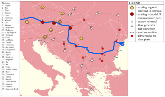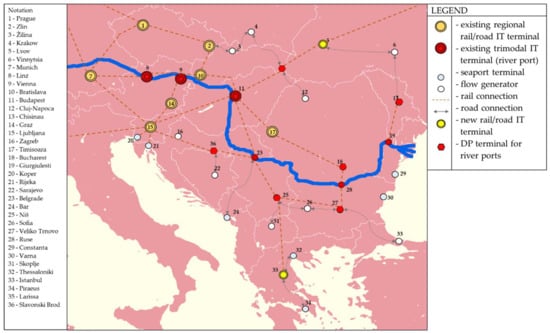 The existing research of the DP concept focused exclusively on the container flows that pass through seaport terminals. Having in mind that the profitability of IT mainly varies according to the analyzed flows, state of the market, spatial and geographic characteristics and logistics systems development degree, it is important to define the development direction of the DP concept and the IT system as well [36]. More or less, all regions of the world have been analyzed through the concept of DP [37,38,39,40,41,42,43], therefore several research articles covering this topic for the region of Southeastern Europe exist as well [44,45,46,47,48]. The main advantage of the DP concept in the context of IT network modelling is its adaptiveness and configurability to different structures of IT systems, geographical regions, and different goods flow categories. So far, the researchers have not considered the DP concept in the context of river ports, and that literature gap is filled with this article.