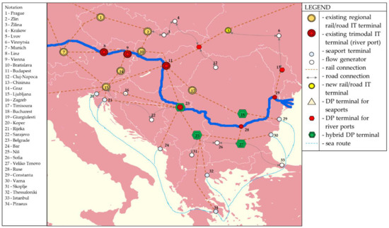 Scenario 6 refers to the most detailed and complex development of the IT network with hybrid terminals in the function of DP for the Danube ports and seaports (Figure 7). It also includes a complete network connection with rail transportation mode, accompanied by the development of new and modernization of existing rail-road IT terminals at strategically important locations in the continent hinterland [1,106].