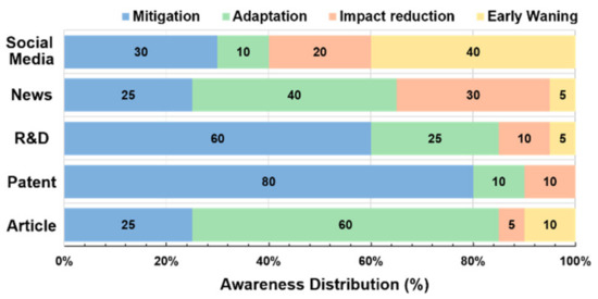 As shown in Figure 2, the status of climate change awareness in each society can be comprehensively verified based on topic distribution. The climate change awareness differences were clearly observed depending on the groups of societies. Based on social media (Twitter) analysis, it was identified that the awareness of the Korean public of climate change largely focused on early warning (40%) and mitigation (30%) in 2017; less awareness of adaptation (10%) and impact reduction (20%) was also observed. News data corresponding to social awareness showed evenly distributed topics on all four awareness indicators despite a low early warning ratio (5%). Awareness of mitigation, adaptation, and impact reduction was observed to be 25%, 40%, and 30%, respectively, which implies that Korean media have comparably wider perspectives on climate change issues. Governmental and academic awareness derived from national R&D and scientific articles mostly focused on mitigation and adaptation topics with a high proportion of 85% all together. However, national R&D focused more on mitigation (60%) research, while scientific articles exhibited adaptation-related topics further with 60% ratio. Meanwhile, R&D data and academic articles showed that awareness of impact reduction and early warning lagged in both groups, inferred from the low proportion of awareness with an overall 15% ratio. Noticeably, industrial awareness represented by corporate patents was observed to be mostly concentrated on mitigation technology (80%). This indicates that the Korean industry paid attention to reducing greenhouse gas emissions for climate change mitigation. However, it is recognized that other awareness targets, such as adaptation, impact reduction, and early warning, fell behind compared to mitigation: in particular, the early warning awareness was not observed in industrial groups.
