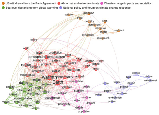 In the above section, the holistic distribution of topics from respective documents was verified to identify climate change awareness in each group through LDA topic modeling. Additionally, one more useful technique to extract valuable insights from a large volume of text data is the term co-occurrence network [48]. As a kind of content analysis, the term co-occurrence network is useful to understand the underlying content structure and relatedness in detail between co-occurring terms constituted in the document [49,50]. Visualization of the data, particularly the co-occurrence network, enables intuitive human cognition improvement [10,51]. In this regard, a co-occurrence network is advantageous for visualizing the association and patterns between items (terms) as a two-dimensional map [6,48]. Furthermore, it could provide a sub-network, called a community or cluster, which indicates aggregates of items (terms) with similarity. In other words, it implies connections between co-occurring terms within a particular theme. Term co-occurrence networks constructed using documents from each society are illustrated in Figure 3, Figure 4, Figure 5, Figure 6 and Figure 7, and the top 5 terms as a function of degree are summarized in Table 1. The degree is defined as the number of links to a given node. High degree value indicates high co-occurring frequency with other terms, which represents the importance of a term. First, social media data exhibited five clusters having two main words “warmth” and “Earth” in the center of the network with the highest link degree, as shown in Figure 3. The five clusters composing the network were “US withdrawal from the Paris Agreement”, “abnormal and extreme climate”, “climate change impacts and mortality”, “sea-level rise arising from global warming”, and “national policy and forum on climate change response”. The top three terms were “rise”, “sea-level”, and “case” in order. The top five terms based on degree indicate the strongest association with other terms; in other words, they frequently co-occur with other terms. Hence, these words could be considered major thematic keywords dealt with importantly by the actors in the corresponding society. The important thematic keywords dealt with in social media data are related to “warmth of the earth (indicating ‘global warming’)”, “sea-level rise”, and “cases (for abnormal climate and warming)”.