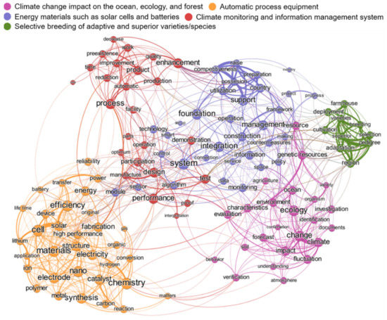 As presented in Figure 5, the national R&D analysis results showed five thematic clusters with a comparably balanced thematic distribution of climate change mitigation, adaptation, and impact reduction. Detailed themes of the clusters are as follows: “climate change impact on the ocean, ecology, and forest” related to impact reduction; “energy materials such as solar cells and batteries” and “automatic process equipment” related to mitigation technology; and “climate monitoring and information management system” and “selective breeding of adaptive and superior varieties/species” clusters related to climate change adaptation. The top 5 terms appearing in national R&D data were “efficiency”, “design”, “system”, “nano”, and “materials”, in order, as summarized in Table 1. The terms “efficiency”, “nano”, and “materials” were associated with the “energy materials such as solar cells and batteries” cluster. In addition, the terms “design” and “system” were observed to be located in the center of the network.