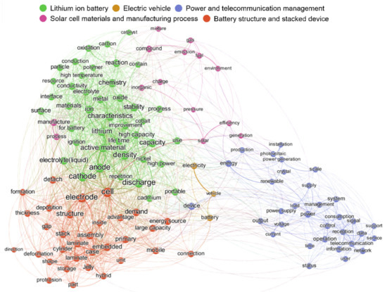 The industrial patent analysis showed five clusters which were all associated with mitigation technology (Figure 6), as verified above in the topic analysis: “lithium-ion battery”, “electric vehicle”, “power and telecommunication management”, “solar cell materials and manufacturing process”, and “battery structure and stacked device”. The terms “cell”, “electrode”, “anode”, “cathode”, and “discharge” were the top five thematic keywords in patent data (Table 1). These five keywords were associated with battery (or solar cell) technologies for mitigating greenhouse gas. Thus, the results reveal that industrial awareness of climate change in Korea is mostly focused on mitigation technology.