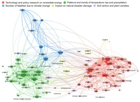 Lastly, the term co-occurrence network of the scientific articles was constructed using VOSviewer software, as illustrated in Figure 7. Since scientific articles solely provide English textual abstracts differently from other documents, VOSviewer, which is specialized for text mining in English, was utilized for the co-occurrence network analysis [22]. However, the method of constructing the network based on the term association between extracted nouns is basically same mechanism [22,52]. The term co-occurrence network built from articles also showed five clusters, but two exhibited minor proportions. There were three major clusters, “technology and policy research on renewable energy”, “patterns and trends of temperature rise and precipitation”, and “number of fatalities due to climate change”, and two thematic clusters, “impact on natural disaster damage” and “soil carbon and plant varieties”, were observed as a minor proportion. The terms “year”, “system”, “level”, “development”, and “increase” were highly important thematic keywords in the academic society. These important keywords are deeply associated with climate change adaptation themes.