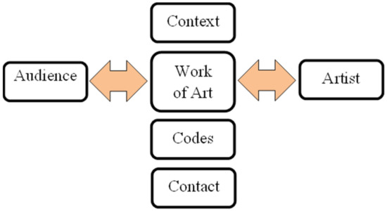 The semantic function of art is considered from different aesthetic and philosophical perspectives, and other aspects. Ahmadi [41] used Jakobson’s [42] model of linguistic communication to sum up these views, and a model for how to transfer meaning through art by considering art as a tool for establishing relationships. Based on this model, which is the basis for further analyses, the meaning of art is first formed by the artist, and then it is received by the audience, and influenced by the historical and social fields (context), the cultural semiotics system (code), and the art transfer medium (contact), as shown in Figure 2.