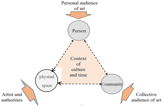 With the advent of art in the public areas of cities, the coordinates of the factors influencing the meaning of art change due to the impact of the local conditions. In this regard, authorities and institutions should be considered in interpreting the meaning of art in urban spaces [1]. On the other hand, the audience of the art becomes public with the generalization of art [2]. Therefore, the cultural context, personal and collective audience, and the artist and authorities all influence the transfer of meaning through urban art. Regarding the assumption that the art is effective in the meaning of the space, the meaning-making factors of the urban art affect the spatial meaning-making poles. Figure 3 illustrates this effect further, based on Gustafson [23] and Ahmadi [41].