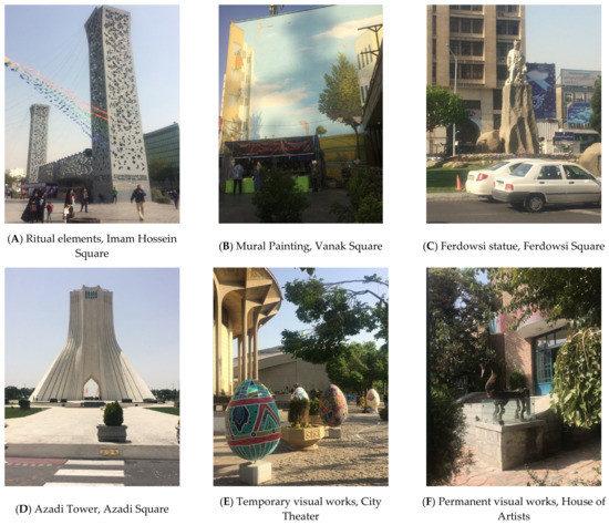 - City Theater: The City Theater complex, as the first modern theater hall in Iran, was opened in the city center of Tehran in 1967. A vast urban space in its front is the venue for street theater. Additionally, modern visual works are established in this space (Figure 4E).