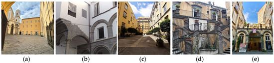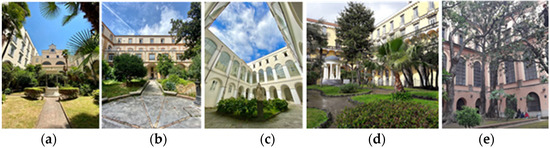 Among them, after a preliminary screening, five cloisters (cloister of San Paolo Maggiore, cloister of Santa Patrizia, cloister of San Domenico Maggiore, cloister of Saints Marcellino e Festo and the cloister of the Academy of Fine Arts) and five courtyards (Courtyard of San Domenico Maggiore, Palazzo Real Monte Manso di Scala, Palazzo Diomede Carafa, Palazzo Venezia, and Palazzo Marigliano) were selected for the study.