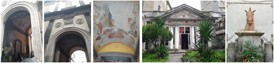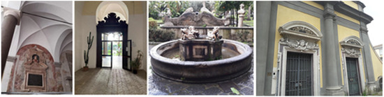 Moreover, all the cloisters, except for the cloister of San Domenico Maggiore, are enriched by blue elements like a fountain with zoomorphic decoration (cloister of Saint Marcellino e Festo), a central well in white marble (cloister of San Paolo Maggiore) or simple fountains (cloister of Santa Patrizia and Academy of Fine Arts). All the cloisters also present protective entrances, with double doors connected by a gate and enriched by cultural value elements. The cloister of San Domenico Maggiore is adorned by four statues coming from the no-longer-existing church of San Sebastiano; the cloister of Saints Marcellino e Festo and the Academy of Fine Arts host some archaeological finds and works of art. The cloister of San Paolo Maggiore is rich in frescos, unlike the cloister of Santa Patrizia, where the frescoes representing the life of the Saint and of Christ have been whitewashed. Today, only a few traces are visible (Figure 3).