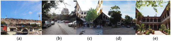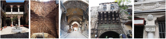 Three of the five selected khans (Figure 6) have an area of more than 500 m2, which is not crowded, with retail trade in the courtyard, and are connected to pedestrian areas (Balkapani Khan, Buyuk Valide Khan and Buyuk Yeni Khan); two are directly connected to a road with vehicular traffic (Vezir Khan and Tas Khan). There are business units (primarily wholesalers), catering units, production workshops and warehouses in the courtyards of the khans (except Tas Khan). Perennial trees, small tree saplings, ivy, potted plants, and flowers were planted in the courtyards. Balkapani Khan and Buyuk Valide Khan have a small masjid in the middle of the courtyard. In the courtyard of Tas Khan are clothing shops that serve tourists, various business units, and a restaurant in the basement, accessed from the courtyard. All buildings have protective entrances and elements of cultural values, such as frescoes, decorative pools, column headings, and historical or brick walls bonded by different bricklaying methods (Figure 7). Except for the Buyuk Yeni Khan, the average height to width ratio of Khans’ courtyards ranges between 0.25 and 0.6. The shadowing is limited to the rare presence of single trees.