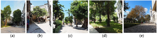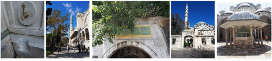 (a) Court of Nuriosmaniye Mosque; (b) Corlulu Ali Pasa Mosque; (c) Gazi Atik Ali Mosque; (d) Sehzadebasi Mosque; (e) Suleymaniye Mosque.