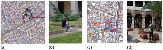In urban acoustics research, sound recordings and measurements are widely used. The soundwalk approach was used for this study to carry out sound recordings. The acoustic measurements were performed twice a day, one in the morning and the other in the afternoon, inside the courtyard (IN) and along the selected paths (PATH A–PATH B) (Figure 10).
