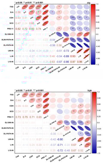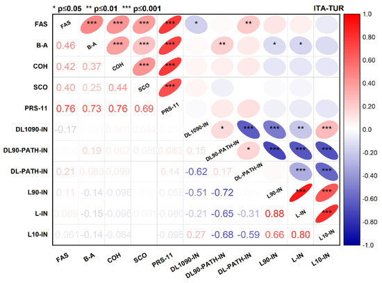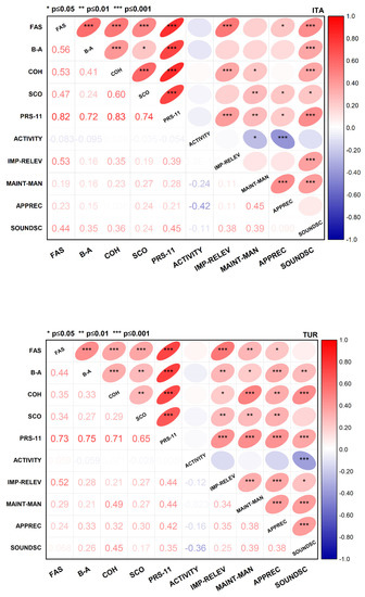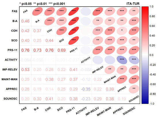 The Pearson correlations’ matrices of the five macro-aspects and the Perceived Restorative Scale were calculated for the all those interviewed (Figure 12), as well as for the Italian and Turkish sub-groups (Figure 13). Considering the full sample of 200 interviewed, Figure 12 shows that, except for Activity, all the factors are significantly correlated with all the dimensions of the PRS-11. High correlation coefficients emerged between Importance/Relevance and PRS-11 (rpear,ITA-TUR = 0.41), Soundscape and PRS-11 (rpear,ITA-TUR = 0.38), Maintenance/Management and PRS-11 (rpear = 0.37), and Appreciation and PRS-11 (rpear,ITA-TUR = 0.29). The strongest positive correlation coefficients emerged between Importance/Relevance and Fascination (rpear,ITA-TUR = 0.53).