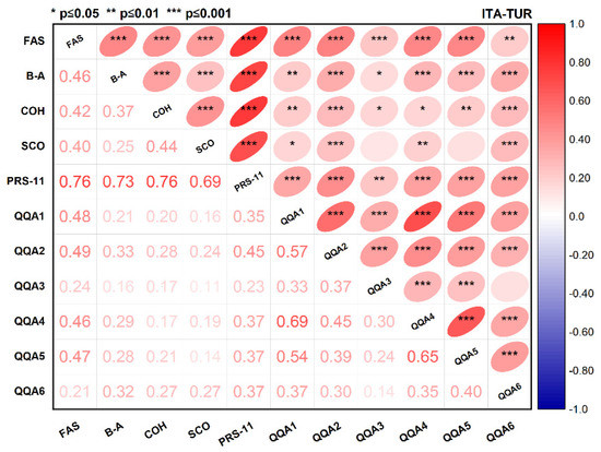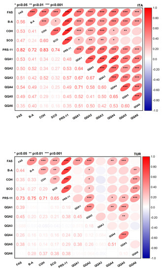 Pearson correlation matrices of the Perceived Restorativeness Scale (PRS-11), its components: Fascination (FAS); Being-Away (B-A); Coherence (COH) and Scope (SCO) and the Qualitative Aspects (QQA). Total sample (Italian and Turkish).