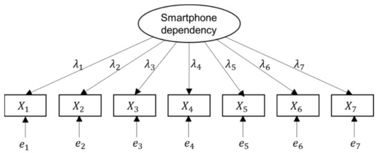 To investigate the relationship between smartphone dependency and the use of a smartphone while driving, various statistical techniques and models were applied by using statistical software program, R. To quantify the smartphone dependency of participants, factor analysis was utilized. Factor analysis is a statistical method used to find potentially unobserved variables underlying manifest variables. Because smartphone dependency is a latent variable that cannot be observed and measured directly using a single item, a single factor model was selected based on the seven items asked about smartphone use (see Figure 1). As this seven-item scale has already been validated by the Korean Children and Youth Panel Survey, we proposed a single factor model that consists of seven items. Arrows from smartphone dependency to items () indicate that latent smartphone dependency affects the respondents’ response scores, which were manifest and measurable factors, and that the rest of the variance can be explained by the error terms ().