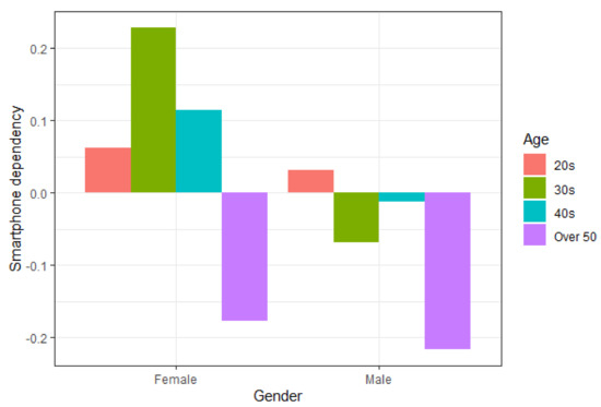 To explore the difference in smartphone dependency among the different demographic groups, an analysis of variance (ANOVA) was performed in this study. A two-way analysis of variance, which is an extension of the one-way ANOVA, examines the effect of two different categorical independent variables on one continuous dependent variable. The two-way ANOVA not only aims to assess the main effect of each independent variable, but also considers the interaction between them. In this study, the two-way ANOVA model was fitted to investigate the effect of age and gender on smartphone dependency. The factor score of smartphone dependency derived from factor analysis was used as a dependent variable.