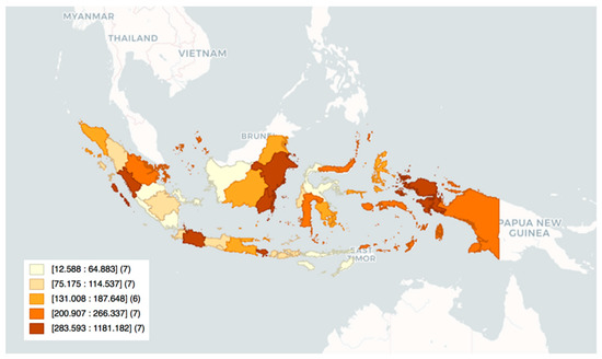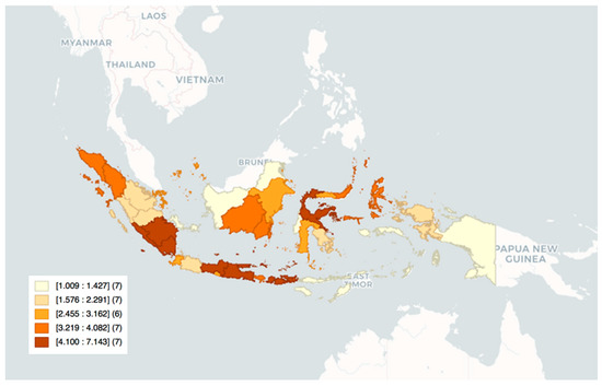 The public health development index employs 30 public health indicators based on the Indonesian Basic Health Survey conducted in 2013 [24]. The competitiveness index has been developed by averaging the sub-indices: quality of life and infrastructure development, macroeconomic stability, financial businesses and manpower conditions, and government and institutional setting [25].